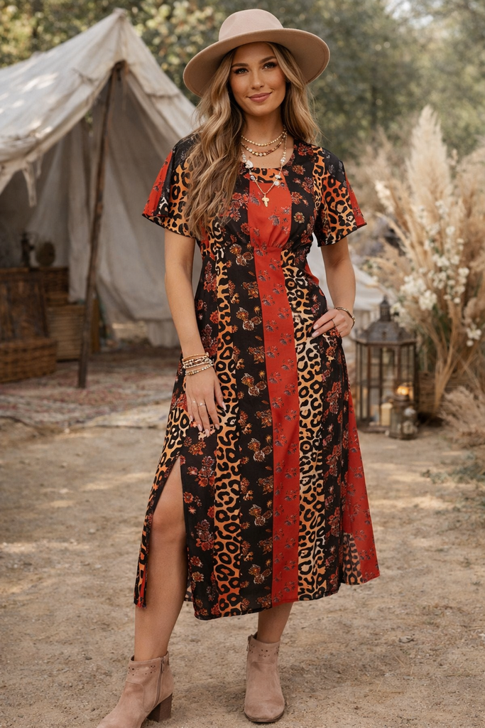 Our Megan Angel Sleeve Split Leg Midi Leopard Multi Print dress is a best seller for a reason! The figure-skimming style adds serious sass to every look!  Featuring a side split, bell sleeve detailing, cinched in waist, and a striking animal print. Pair with trainers for a serious chic casual vibe or heels for the ultimate jaw-dropping party.