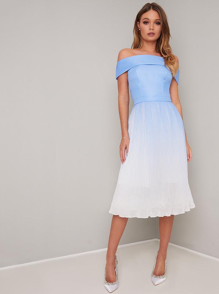 Blue skies are coming, and the Marlie  dress is the perfect piece to wear when they arrive! A dreamy ombre effect covers a floaty pleated skirt and a feminine fold over bardot neckline is perfectly matched with dainty jewellery